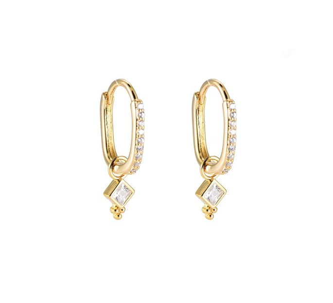 Deze oorringen met hanger zijn een super mooie toevoeging aan jouw oorbellen collectie! Het ringetje heeft een ovale vorm met zirconia steentjes erin verwerkt. Aan het ringetje hangt een klein hangertje in de vorm van een ruit. De oorbellen hebben een makkelijke kliksluiting. Ook verkrijgbaar in zilver.