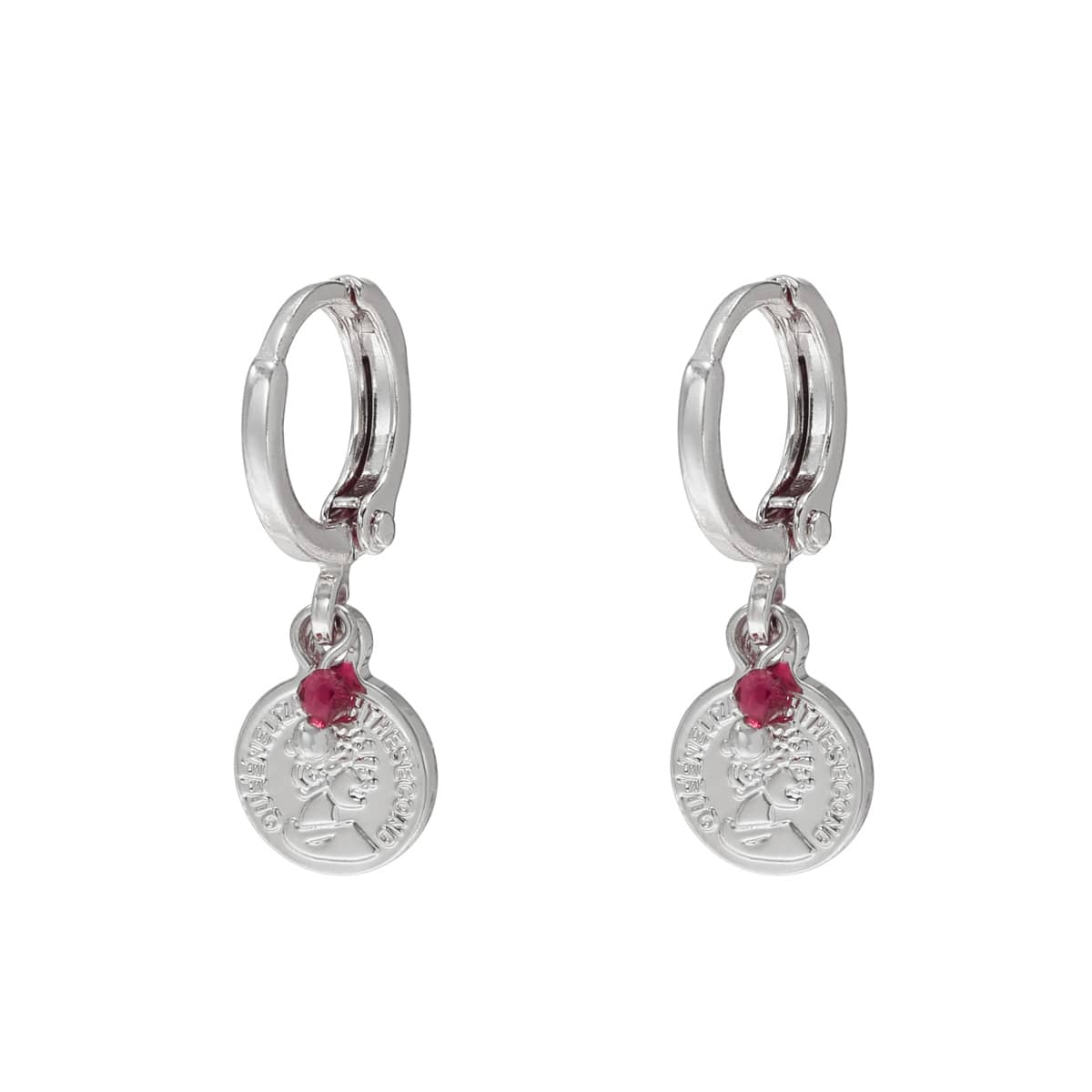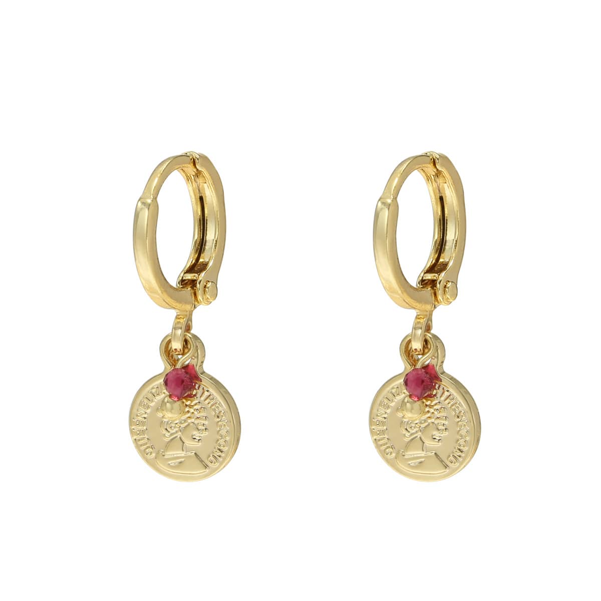 Deze schattige oorringen hebben een munt als bedel met daarop een subtiele gravure van Koningin Elizabeth II. Door het fuchsia gekleurde kraaltje voeg je een pop of colour toe aan jouw earparty!